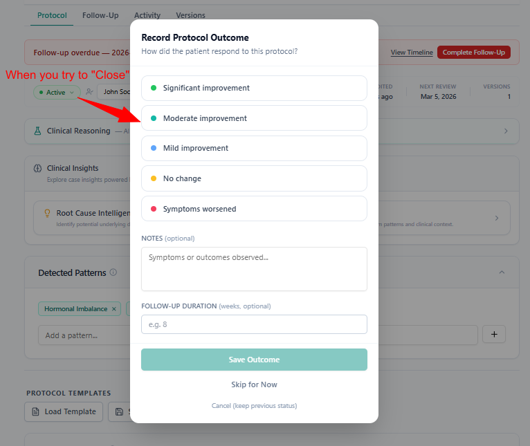 Outcome Tracking helps you record how a patient responds to a protocol over time.